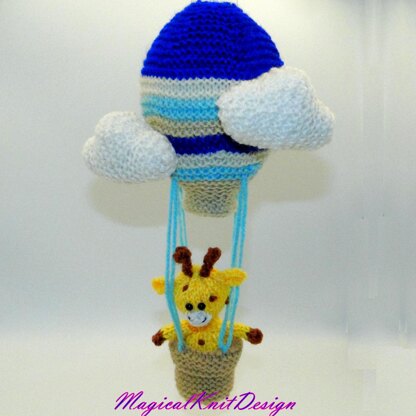 This is Ginger the giraffe on the air balloon flying in the middle of the clouds, knitted flat with straight Knitting needles, easy to follow pattern, with row by row written instructions and photo-tutorial.
