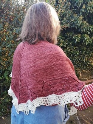 This top-down, triangular shawl is inspired by the gingerbread houses that start to appear in shops and illustrations as we approach Christmas and the depths of winter. It evokes warm and snuggly feelings, while also being a gentle knit. This shawl has a bit of a sense of fun, with its lace house motifs and icing inspired border. Wearing it while enjoying a hot drink and some gingerbread or other seasonal snack is highly recommended!