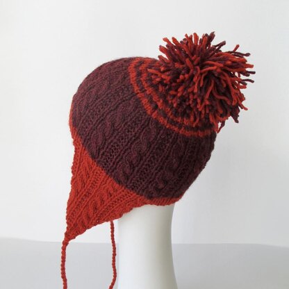 This hat knits from the bottom up. Ear flaps are knit flat and then attached by a cast on brim. Hat knits like a regular bottom-up hat from there.