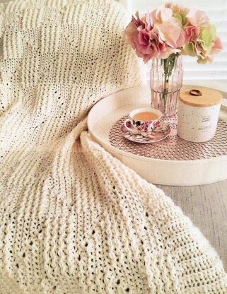The Gingham Gansey Afghan is a beautiful knit-look design, featuring alternating textured blocks of ribbing and slanted eyelets.