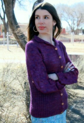 This women’s cardigan sweater features a simple knit/purl textured pattern on the lower half, with stockinette stitch sleeves and upper body. It is worked in one piece from the bottom hem up to the armholes. The sleeves are worked in the round up to the armholes and then all pieces are joined and the sweater is shaped with raglan sleeves/shoulder shaping up to the neck. The neckline, front bands and hems are worked in garter stitch.