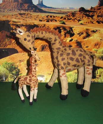 Here is proud mother Georgina giraffe showing off her baby Georgie. Georgina is knitted in dk yarn on 3 mm needles and measures a whopping 20 inches high and 10 inches long, well she is a giraffe! Baby Georgie is just 9 inches high and 4 inches long. The knitting pattern contains intarsia charts where appropriate and this is a great opportunity to test your colourwork skills.