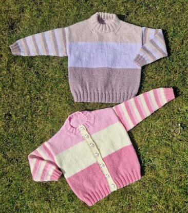 A simple stocking stitch Cardigan and Sweater using stripes to give a beautiful effect, a perfect addition to a little ones wardrobe
