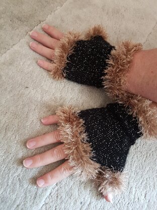 These furry fingerless gloves add a glamorous touch to any outfit and have proved very popular. I once received four complements in one day, while wearing them, and was told I should make and sell them. The pattern is quite easy, but I have categorized it as intermediate due to the furry Eskimo wool. This wool can be challenging to work with as it is impossible to pick up any dropped stitches. If you have already mastered working with this wool it should be a breeze for you. I find it well worth the effort as I love the fur trim effect it produces.