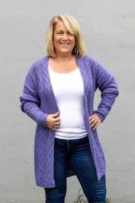 a long cardigan jacket, worked side to side with stockinette and basket weave to give it an interesting texture. This pattern goes to size 52 Valley Yarn Deerfield is a wonderful yarn to work with, alpaca blend. Can be made in Valley Yarn Superwash DK as well