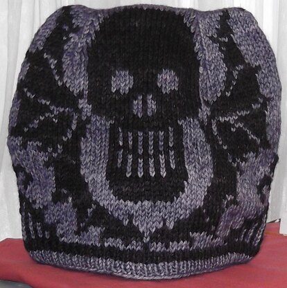 This is worked in the round beginning with the bottom ribbing and closed at the top with a 3-needle bind off. The only shaping is on either side of the top of the skull. So, all in all, this is a pretty quick knit. The directions are written for the ribbing, then you will work from an easy to read chart. The design is repeated twice over each round.