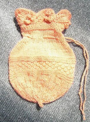 Goblin market is a reticule with a Victorian feel. It features a richly textured leaves and berries border, the body of the bag has a shape loosely inspired by pomegranates and poppy capsules and uses several distinct pattern stitches for a fast, interesting knit.
