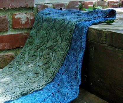 lace scarf in waterlily pattern interspersed with waving waters, picot edging on sides & twisted stitch ribbing at bottom edge