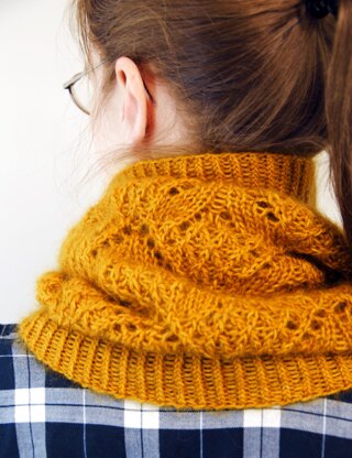 Golden Hour Cowl features an intricate and undulating lace pattern reminiscent of hourglasses. Create your own magical moment with this shimmering cowl knit with one strand of fingering-weight sock yarn and the other a fluffy silk-mohair. Choose two yarns with similar colors to let the lace pattern shine.