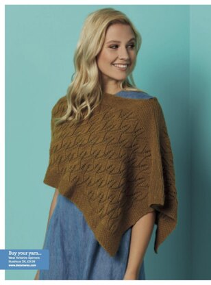 A stylish rectangular poncho knitted in one piece with lace panels on the front and back. It is constructed in one piece starting at the bottom. Part of the top edge is joined with a three needle bind off leaving space for the head. Yarn: West Yorkshire Spinners Illustrious DK ; 4 (4, 5, 5, 6) balls in Shade (07) Antique Gold. (225 m per 100g ball); 70% Falkland Wool, 30% British Alpaca 22 sts and 33 rows to 10 x 10 cm measured over St st. 4 mm circular needle, 80 cm.