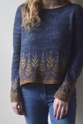 Goldenfern is a simple, seamless circular yoke sweater with colorwork details on the body and sleeve cuffs. This design is inspired by ferns lit aglow by the sunset on an evening walk in the forest. Knit from the top down, you can try on this sweater while it’s in progress, for your ideal fit. This yoke is very easy to knit - it includes a little bit of raglan shaping before the body and sleeve separation, to make for a great fit in the shoulders. For the colorwork, use 3 colors of your choice to create a fading effect, a single contrasting color or you can use a gradient yarn. Fingering or sport weight yarn. Designed to be worn with 4-8”/ 10-20.5 cm positive ease. Shown in size B with 4” / 10 cm positive ease.