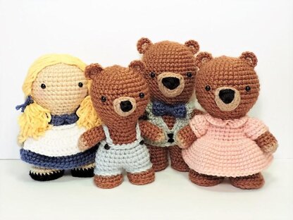 This Goldilocks and the Three Bears pattern set features original amigurumi designs. Your PDF purchase includes the patterns for all four characters in this set. You'll need the yarn colors pictured (worsted weight), a size E crochet hook, safety eyes, a yarn needle, sewing needle and thread, and an intermediate crochet skill level. The finished toys are 5 1/2" - 6 1/2" tall.