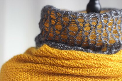 Construction Goldtau is knitted in the round and bottom up in two continuous sections. Garter stitch makes for a squishy and comforting cowl that is wider at the base. A lacy mesh layer folds outwards to contrast nicely against a dark or light background.