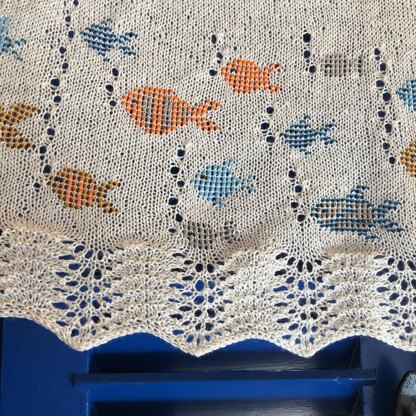 Gone Fishing is the perfect project for when you want to take some time out. It starts off as a simple, meditative knit as you work a relaxing stretch of smooth stockinette stitch, and then bead by bead little fishes begin to appear. It’s so satisfying seeing the shoal of fish start to grow as they swim across the middle of the shawl. Simple k2tog, yo lace stitches form lacy air bubbles from the fish, and once they are completed it’s time to expand on the lace stitches to work the border. A pretty feather and fan lace stitch completes the design, creating soft waves that ripple along the bottom of your shawl.