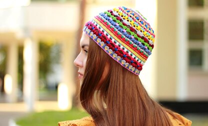 Colorful crochet hat pattern “Good Mood” includes: • Hook and yarn suggestions (original beanie was crochet with 100% cotton, Begonia Yarnart) • Crochet symbols in standard U. S. terms • Gauge • Explanation for particular stitches • Written pattern • Graph pattern