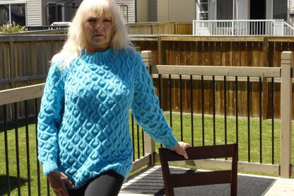 This pattern is absolutely gorgeous and this sweater is really light weight but also really warm. It looks like everything was made up in one piece somehow, the seams just blend in great. Wear this with a nice skirt or your favorite jeans on the weekend. The neckline is not too high so it doesn't feel like it is choking you but gives it a nice finished touch. You will get so many compliments, everyone will want one. You need 9 balls Sirdar Snuggly DK colour pixie or it is shown in Ice Yarns super baby, colour turquoise and you would need 4 balls.