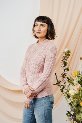 SUMPTUOUSLY SOFT, this jumper is knitted in a luxurious mix of baby alpaca and silk from UK Alpaca. Sarah Hatton has paired cables and twisted stitches with a tactile fabric of Irish moss stitch, and she has given the garment a slightly raised collar. The cable patterning is complemented by a sprinkling of embroidered lazy daisy stitches in a contrasting colour.