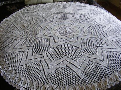 As with my other designs it has been knitted from the centre out. The design radiates from the centre and is divided with honeycomb lace