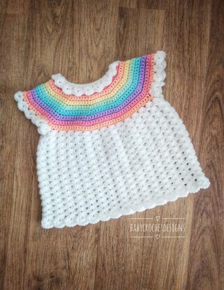 This shell effect dress is made from the top down with a round yoke. It has a button opening at the back so it has plenty of space for putting over babies heads.