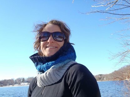 This gradient cable cowl is knit in the rounds, first start with 2x2 ribbing, work the cable pattern and end with 2x2 ribbing. The gradient color change is created by working with two strands of yarn, replacing one strand of color at the time.