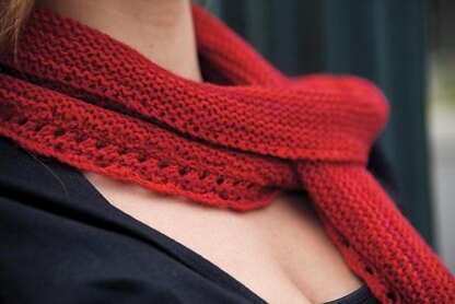 Knitting on Graham begins with the shell edging. Once this portion is completed the piece is bound off. To shape Graham stitches are picked up at the end of every row. This continues until stitches have been picked up along the entire edging. Wear the Graham scarf by placing the widest portion over one shoulder. With the slotted end at the front of your body, wrap the ends to meet over your opposite shoulder. Drape the end at your back over to the front of your body and through the opening.