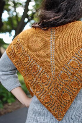 A simple but elegant shawl, Granary begins with a basic stockinette body and finishes with a delicate lace border. Together, the leaf motif and the rich, golden brown dye of The Plucky Knitter yarn evoke the drying crops stored in the granaries of colonial Boston.