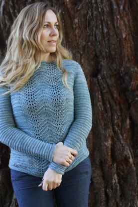 Adult version of Manon sweater, featuring a Feather and Fan lace panel at the front and a wide boat neck. It is worked in the round from the top down in one piece with contiguous set-in sleeves method developed by [Susie Myers][1] and no seaming.