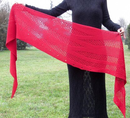 Grand Prix is an asymmetric, crescent shape shawl worked from the top edge down to the short row edging, with increases at both ends. The pattern features relaxing garter stitch and lace short row inserts for an uncommon shaping.