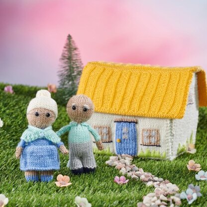 This knitting pattern is to make a pair of dolls and a doll’s house. The house roof and wall open up so you can add doll house furniture inside during playtime, and store your dolls at the end of the day. The doll house is made by knitting wall panels and covering plastic canvas grids that are cut to shape. These plastic grids are available from most good craft stores, and are usually used for embroidery projects. If you cannot find plastic grids you could use stiff cardboard instead. The exterior of the cottage is embroidered with Swiss Darning to add the windows and doors and a chart is included. Grandma and Grandpa both have spectacles made by bending jewellery wire into shape, but for safety, do not add spectacles if these dolls are for younger children as the ends of wire can be sharp. For confident beginners and above, other techniques used include casting on and off, knits, purls, increases and decreases, and seaming to finish.