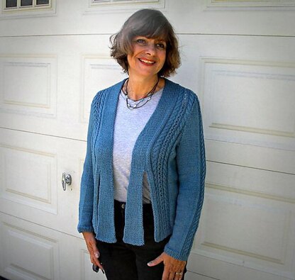This a graceful cardigan with ties at front, and lace and cable detail on fronts, back and sleeves.