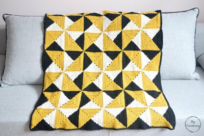 Modern look for a classic granny square blanket. Make your own Granny Pinwheel Blanket and increase the beauty of your home decor. This blanket consists of 48 granny squares joined together with a mattress stitch and assembled with one row of half double crochet. You can easily adjust blanket size according to your preferences and make it as big or small as you'd like.
