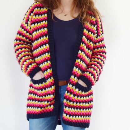 The Granny Rocks cardigan is a fun & colourful longline cardigan which will put some playfulness into your wardrobe! It can be made using any Double knit / 8 ply yarn and can easily be customised to any length, from cropped to ankle length! Your purchase includes two PDF patterns - regular and plus size. Regular comes in bust sizes 72cm up to 112cm. Plus size comes in bust sizes 117cm - 147cm. The Granny Rocks cardigan is simply constructed using rows of granny stripes, the only shaping is on the sleeves. The cardigan is worked flat and seamed together at the end, then the front rib and pockets are added. The only skills needed are front/back post rib & granny stitch. There are stitch diagrams to illustrate the sleeve increases. For more inspiration, and to see how it looks in varying lengths, why not check out my testers versions on Instagram by searching for the hashtag #grannyrockscardigan.