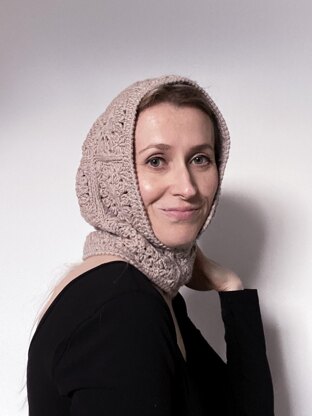 A balaclava is made from crochet motifs that are a spin off of the classic granny square. This square motifs have lace elements that give the balaclava an interesting texture and add a delicate and feminine touch.