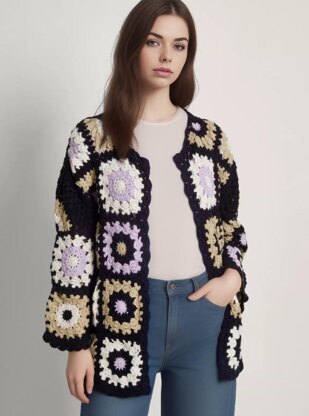 Make your own stylish and cozy cardigan with this crochet pattern! This design features bold granny squares in a clean, contemporary color palette of black, lilac, beige, and cream. Perfect for all seasons, this cardigan offers a relaxed fit and a timeless look.