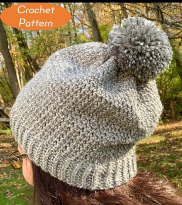 Granularity uses only 2 stitch patterns: an easy yarn-over slip stitch for the brim ribbing, and a single / double crochet combo for the body of the hat. The brim is crocheted flat then joined. The hat body starts by picking up stitches around the brim, then crocheted in rounds. Finally, the top is closed like a drawstring. A pom is optional. The pattern includes instructions and yardage for 2 sizes using the Clover Pom Maker.