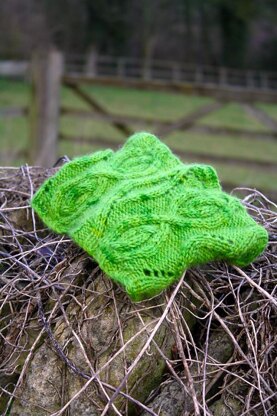Cables and ribbed lace wind around a grassy stretch of cashmere. Pattern comes with both fully written and charted instructions.