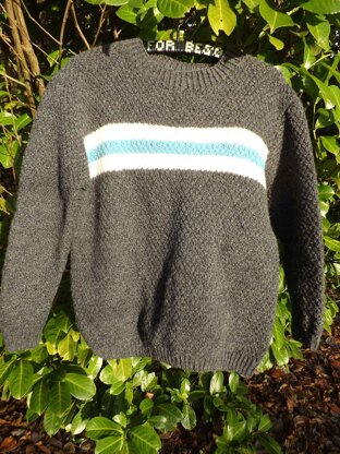 This is a sweater/pullover knitted from the bottom edge and up with a textured allover pattern, stripes and set in sleeves / modified drop shoulders. The Sweater has traditional rib edges. The pattern is made for at yarn with a gauge of 18 stitches per 10 centimeters (textured pattern) i.e. a yardage of 90 meters per 50 grams. Pictured in Sandnes Peer Gynt / Mor Aase.