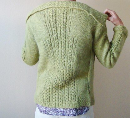 I especially like the textures on each side of the collar. Subtlety - this must be the perfect word to describe them. Each side is slightly different, not overly yell about their existence, but their characters are there. To differentiate the collar, the back and the sleeve have eye-catching lace, which is fun to work with. I guarantee you will enjoy working this cardigan from the start to finish.