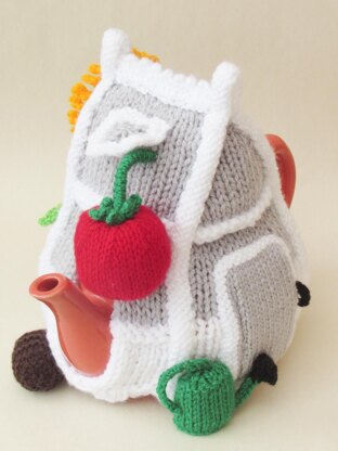 The main part of the tea cosy forms the actual greenhouse. The structural parts of the greenhouse are white and the 'glass' is silver.