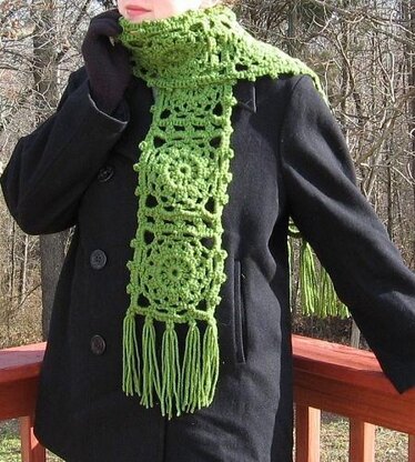 I was inspired to create a scarf with lovely, lacy detail while still using simple square construction. Using a quick join-as-you-go method makes assembling this scarf a snap, while also giving you the flexiblity to increase or decrease the length of the scarf as you choose. You may even want to try a using a thinner yarn and hook to create more dainty squares or use multiple colors of yarn for a completely unique look.
