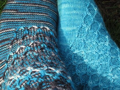 Don't sit on the fence: jump in with both feet! Wire netting ― "Grillage" in French ― doesn't have to be harsh and cold: this "chicken wire" inspired pattern wraps around your leg and provides extra warmth with the cosy garter stitch underlay. The elongated stitches of the netting showcase variegated yarn nicely, but look equally nice with a semi-solid. Grillage also incorporates a roomy short-row heel featuring "shadow wraps", for extra comfy socks (Tutorial included)