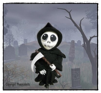 A very un-scary, 11 inch high comical Grim Reaper. This little Halloween figurine, will add a bit of fun in between the other scary decorations on October 31st. Knitted flat, using DK yarn on 3mm needles, from a easy to understand and follow pattern, which contains many photo's to help you get the perfect finish. No complicated stitches or shaping - just fun to make :o)