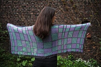 This elegant shawl is worked in a variation of the entrelac style. It has a striking geometric pattern, combining simple double crochets with a nifty construction.