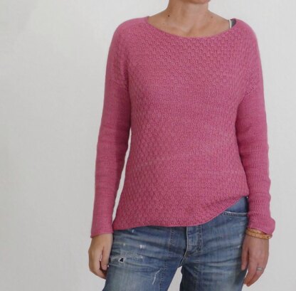 Groupie is an easy to wear T-shirt. The sweater is worked seamlessly from the top down. The neck is shaped with short rows before you work the dropped saddle shoulders by increasing along the shoulder markers. When you reach the body width, you work the back and front separately for the length of the armhole. Then you join front and back and work the body in rounds down to the bottom. After the body is completed, you pick up the sleeve stitches to work the sleeves in the round.