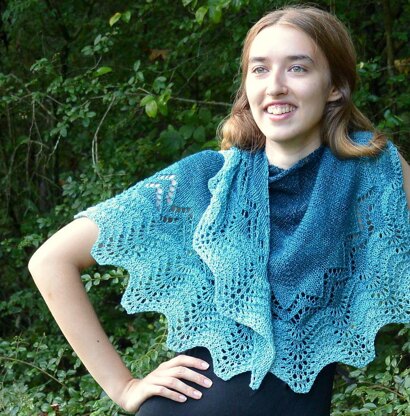 It’s knit from the center back down with a single 100-gram skein of luxury sock yarn. The unusual shaping helps it stay on the shoulders nicely. Pattern is suitable for the Advanced Beginner to Intermediate knitter. Techniques required: basic stitches, increases and decreases, simple shaping, basic lace techniques (yo, k2tog, ssk, sk2p, M1, kfb, kfbf). Pattern was written for a 490 yds skein of yarn but is easy to adjust for smaller skeins of yarn.