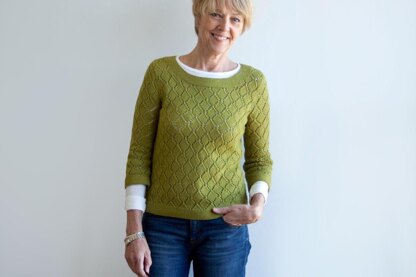 *Gussie *– a lace knit with gentle shaping and three-quarter length sleeves is a perfect multi-season outfit topper! Dress it up or down with layering. Wide garter stitch bands trim its scoop neckline and hems, and balance the active diagonal of its lace – a 10 stitch by 16 row repeat that is meditative and easily mastered. Pieces are knit flat, bottom up, with seaming. Enjoy!