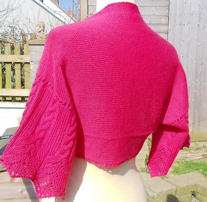 This pretty shrug with its cable detail on the sleeves is perfect for those cool spring evenings. This shrug is knitted in one piece, starting with a provisional cast-on. The three quarter sleeves are knitted in the round with the back section knitted flat so avoiding seaming.