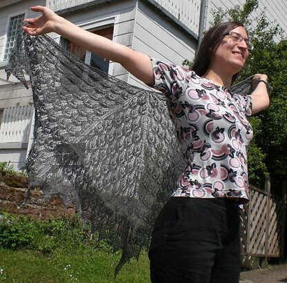 The small Gwendolyn is made from 100g of lace weight yarn, and the big Gwendolyn (shown in pictures) from 150g, spreading out to a length of 100cm and wingspan of 170cm!