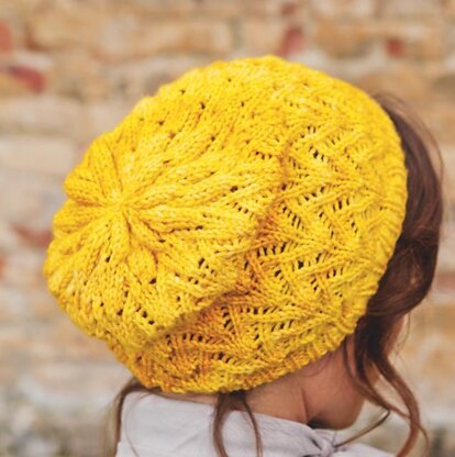 A sunburst pattern in a gloriously rich yellow colour is guaranteed to put a smile on your face every time you see this hat! The lace pattern is worked in a Fyberspates Vivacious DK merino yarn, which provides excellent stitch definition.