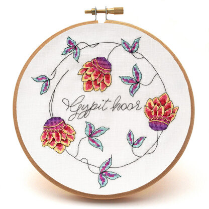 The Jacobean-era inspired botanical wreath of the Gypit Hoor cross stitch pattern holds a secret -- the true cheekiness of the text. The Doric Scottish insult "Gypit Hoor" actually translates to "crazy whore," but of course you could create your own translation for those who are more sensitive like children in the home (or your parents, or that one "special" friend who takes offence to everything...). "Great woman" might be a good fake translation if needed .... The pattern comes with a full black and white pattern and a full colour pattern. Model stitched over two on Zweigart 28ct Cashel linen (Antique White). A link to a tutorial for couching is included in the pattern. ADDITIONAL MATERIALS NEEDED: 1 spool of Kreinik 002J (Gold) Japan Thread #7, as well as one pack of Mill Hill 00557 (Old Gold) size #11 seed beads. You will also need sewing or embroidery threads that match the colour of the Kreinik thread for couching -- 865 Gutermann polyester sewing thread will work for the Japan Thread.